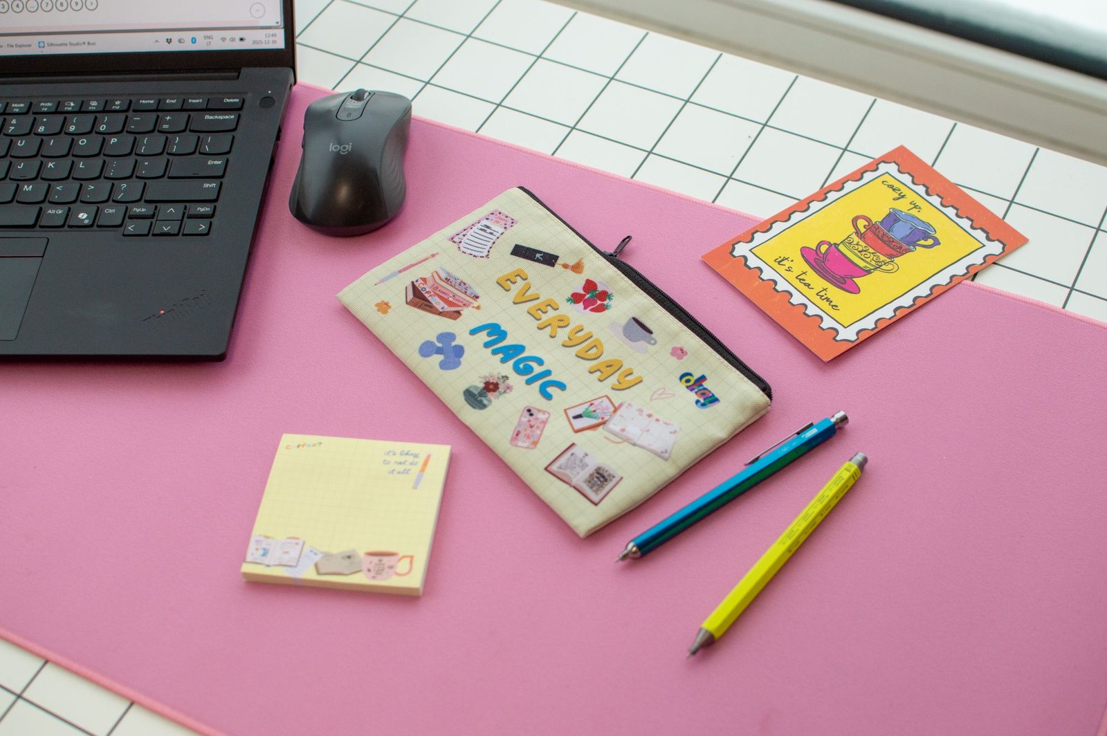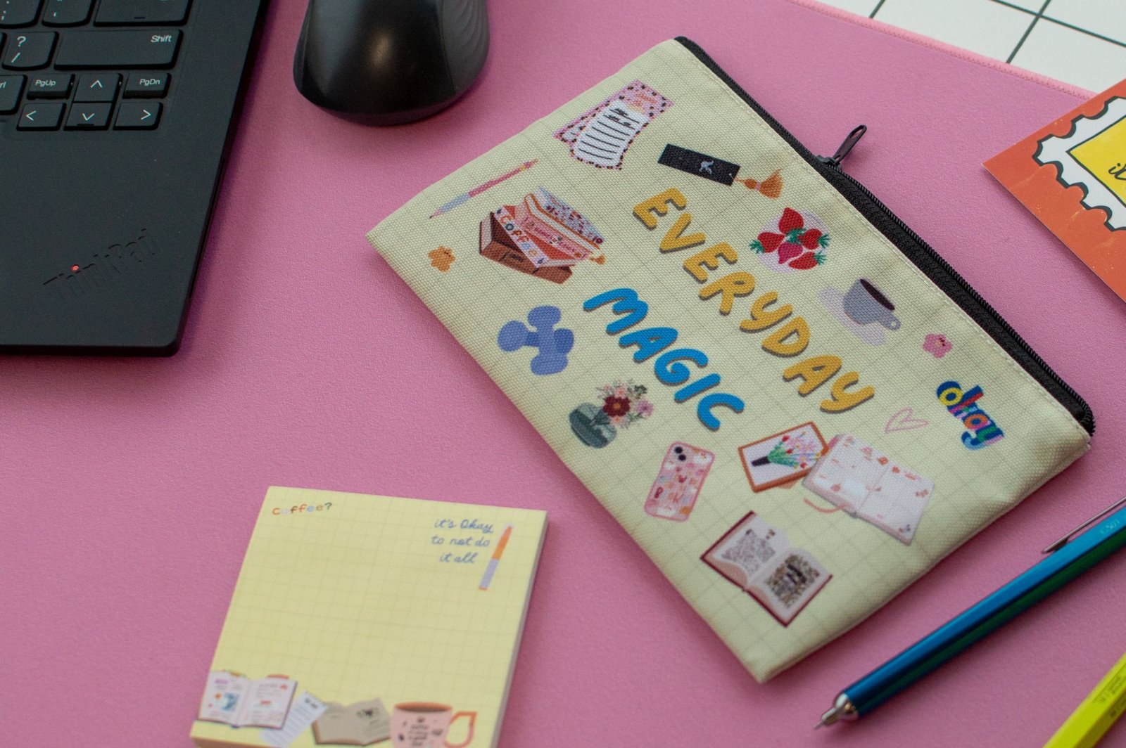 The design features illustrations from the Everyday Magic collection, inspired by quiet routines, coffee breaks, reading moments and gentle productivity. The same print appears on both sides, so it looks good no matter how you place it on your desk or in your bag.