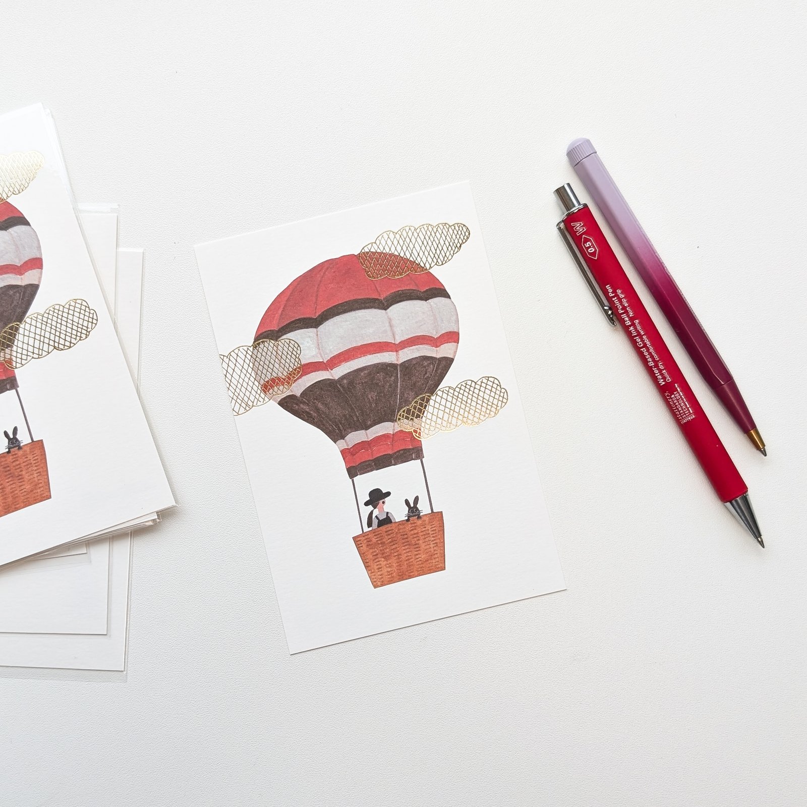 This postcard is quietly special. At first glance it feels minimal, almost airy, and then the details start to appear. The hot-air balloon illustration is finished with subtle foil-stamped clouds that catch the light just enough, without taking over the image.