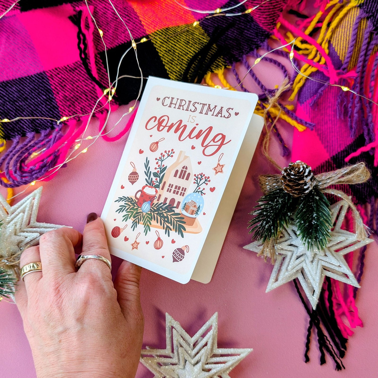 This greeting card feels like the moment December finally clicks into place. I wanted it to look warm, soft, and a little bit nostalgic, so I filled it with tiny festive details: a gingerbread house, winter branches, little ornaments, a mug of something hot, and a snow globe tucked into the scene. Everything sits on a gentle beige background that gives the illustration a calm, homey atmosphere.