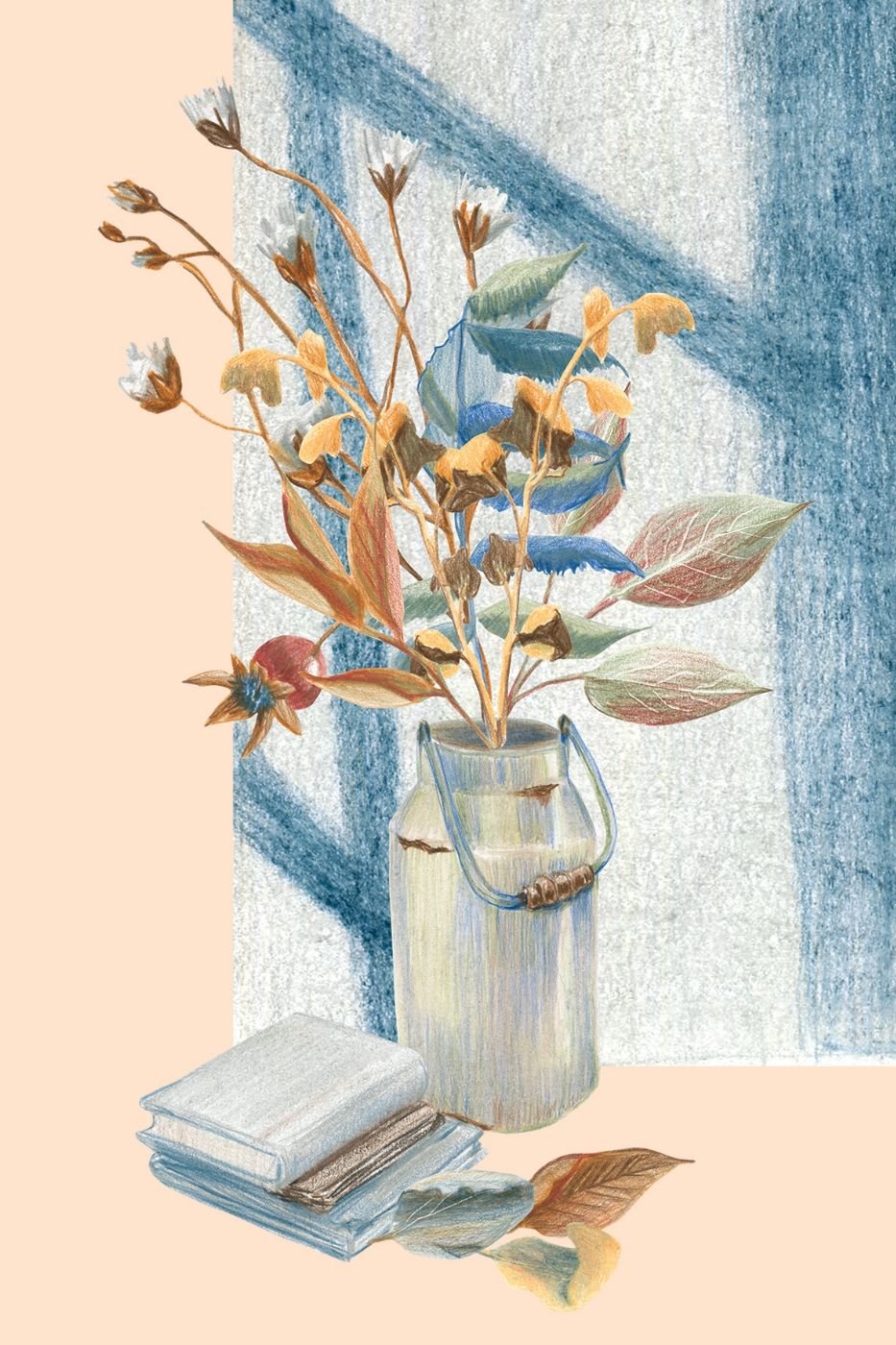 An elegant illustration of dried autumn branches arranged in a rustic jug, with a pair of closed books resting nearby. The soft shadow of the window frame adds a cozy, homely mood — like a quiet afternoon spent reading indoors while leaves turn outside.