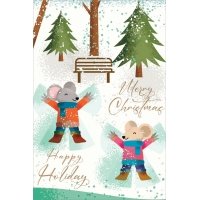 Two little mice are making snow angels in the park, laughing as snowflakes land on their scarves and noses. It’s a postcard filled with winter joy, perfect for spreading warm holiday wishes.