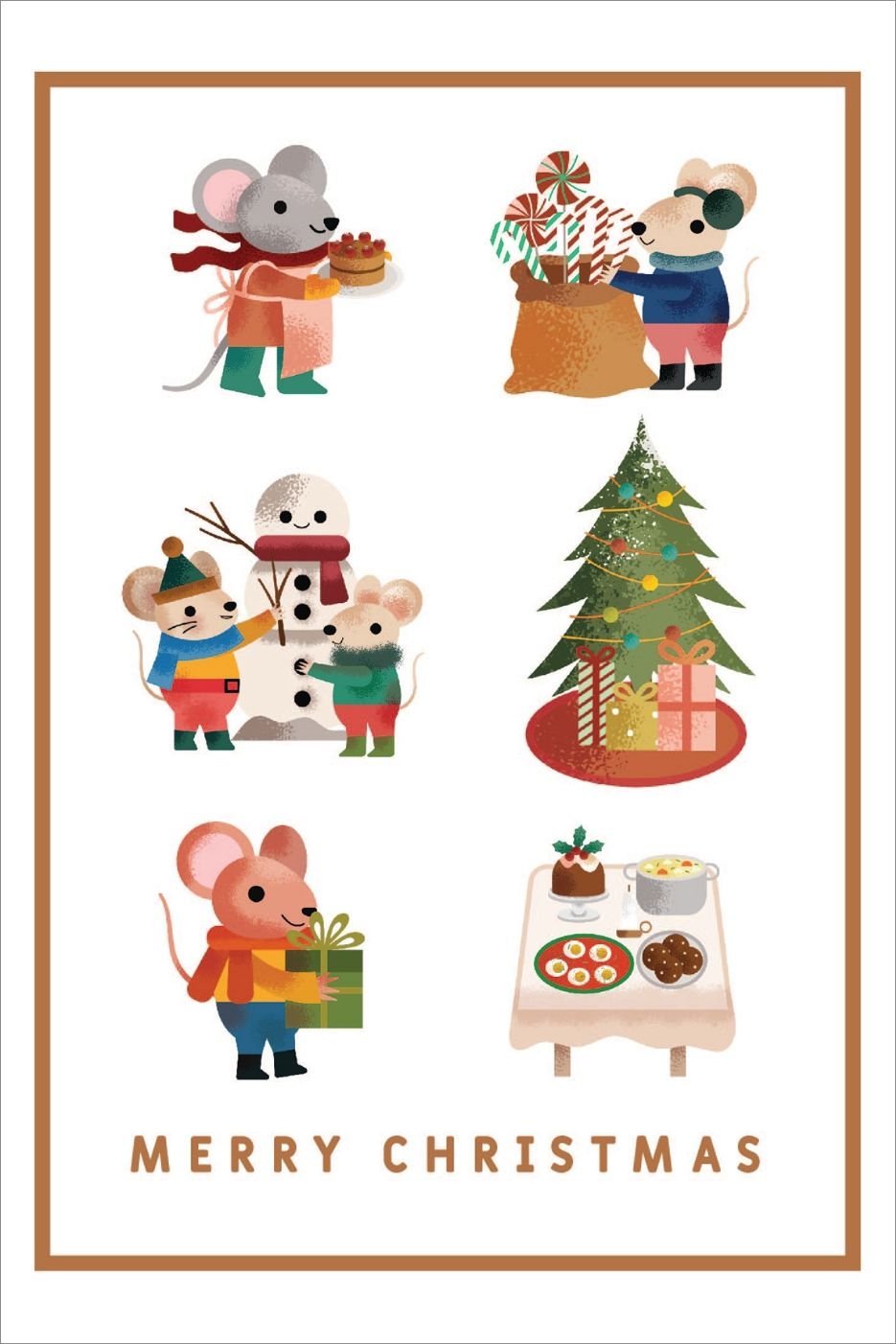 The tiniest Christmas celebration is in full swing. The mice are baking, decorating, and building snowmen, filling every corner with warmth and laughter. This postcard captures the joy of simple holiday moments shared with friends.