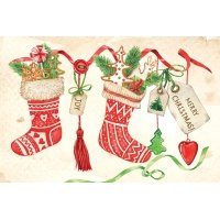 A trio of red stockings filled with gingerbread cookies, pine branches, and little festive surprises — just waiting to be hung by the fireplace. This watercolor illustration captures that joyful moment when every tiny detail of Christmas decor brings warmth to the room.