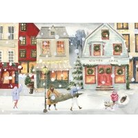 Snowflakes fall softly on a cozy winter street where people hurry by with trees, sleds, and coffee cups in hand. The café glows warmly with wreaths and red doors, inviting everyone to step in for a moment of calm before the holiday rush.