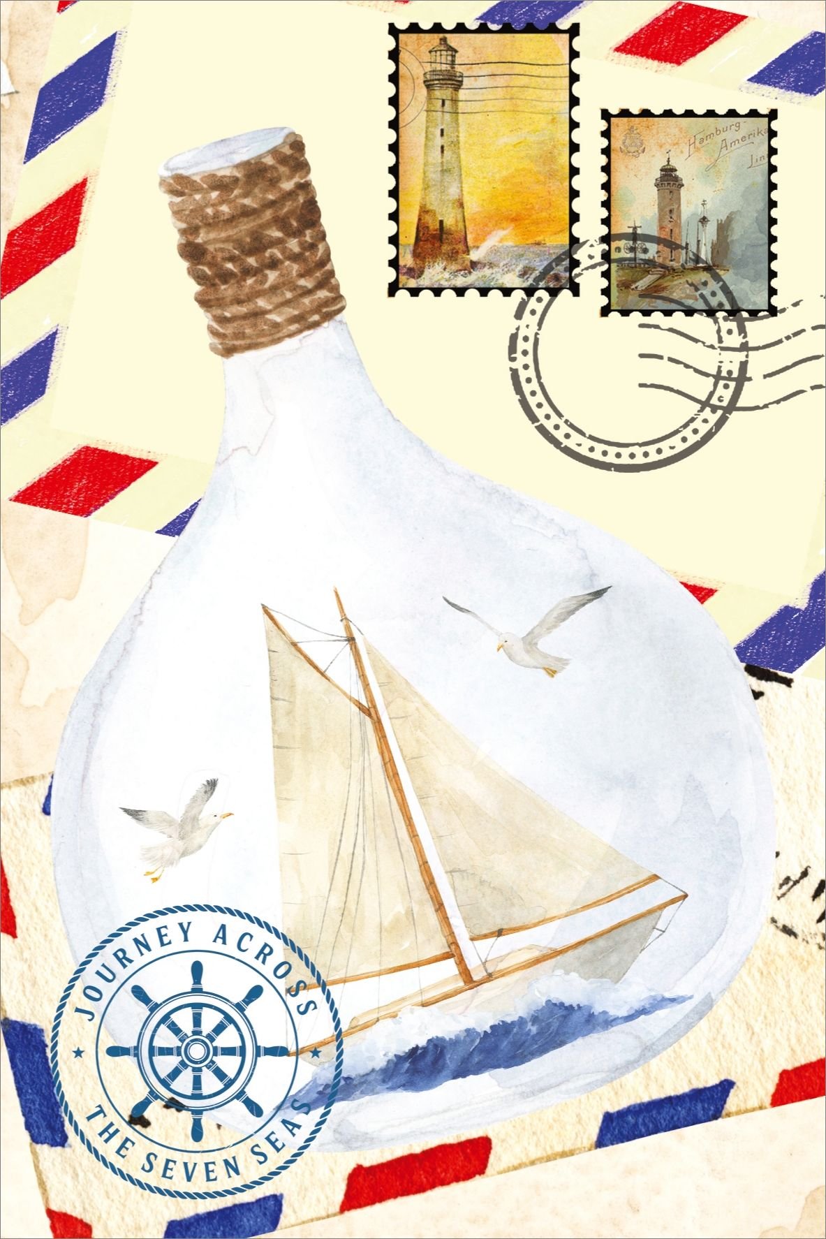 A small sailing ship sealed inside a glass bottle, carrying a journey across the seven seas. This postcard is for dreamers, travelers at heart, and anyone who loves the idea that a letter can cross oceans and still feel personal.