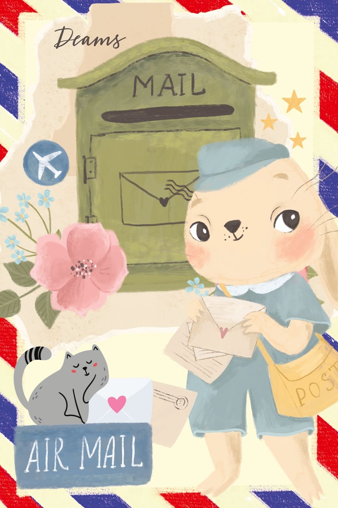 This postcard shows a gentle postal scene filled with soft colors, flowers, and a dreamy character holding letters ready to be sent. It’s a warm, comforting design for messages about hopes, kind thoughts, and little dreams that deserve to travel far. A lovely choice for Postcrossing, pen pals, or for keeping as a reminder that even small letters can carry big feelings.
