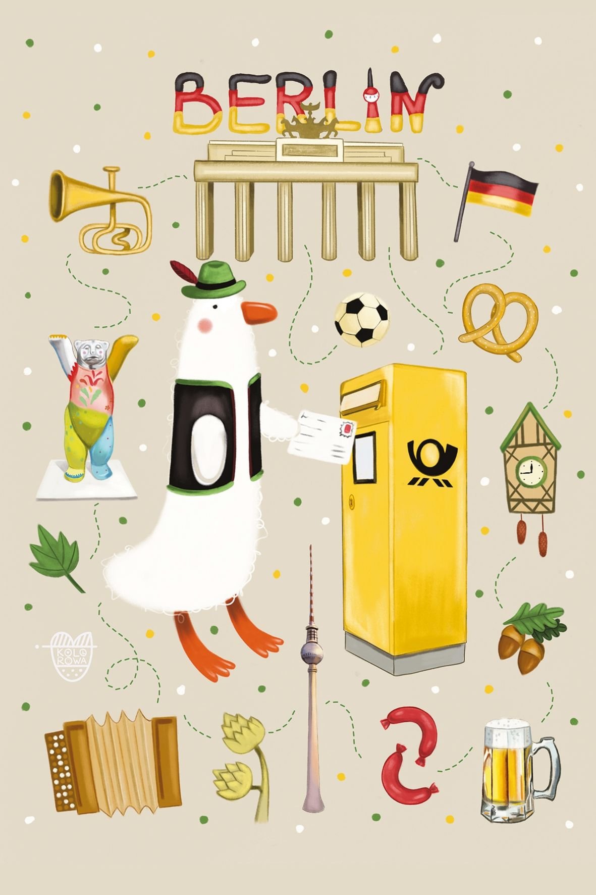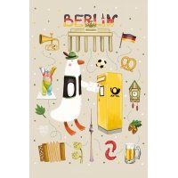 This Goose on Tour postcard features the travelling goose visiting Berlin, with subtle city references in the background. A playful illustrated design suited for Postcrossing profiles that mention countries, travel themes, or character series. Part of the ongoing Goose on Tour collection.