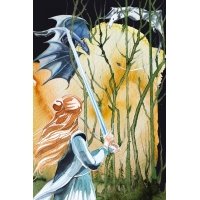Fantasy postcard with warrior and dragons under the moon, detailed watercolor artwork for fantasy lovers.