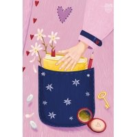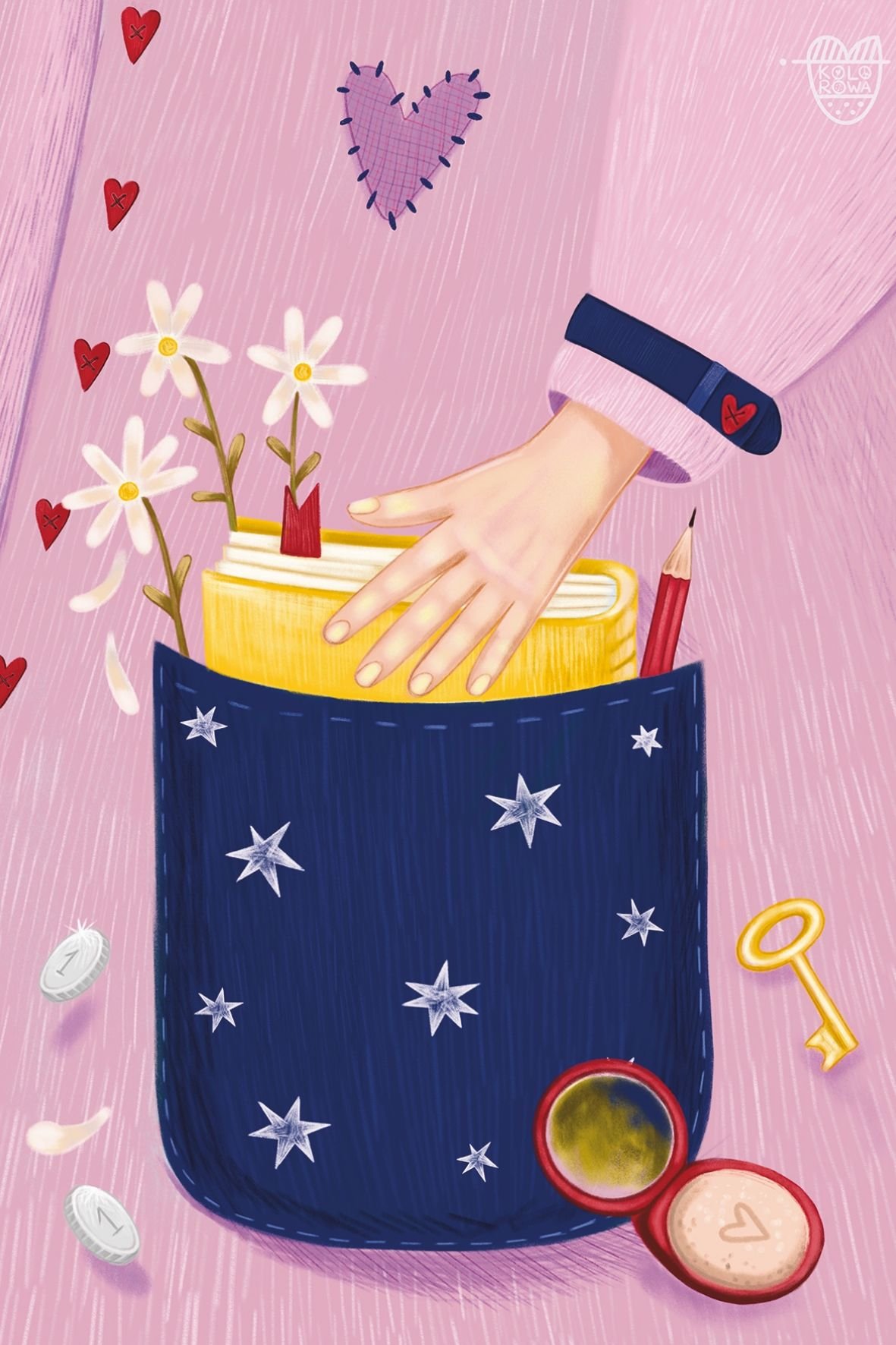 A hand slipping a book into a pocket filled with small objects, memories, and tiny secrets. It feels like carrying your own world with you.
