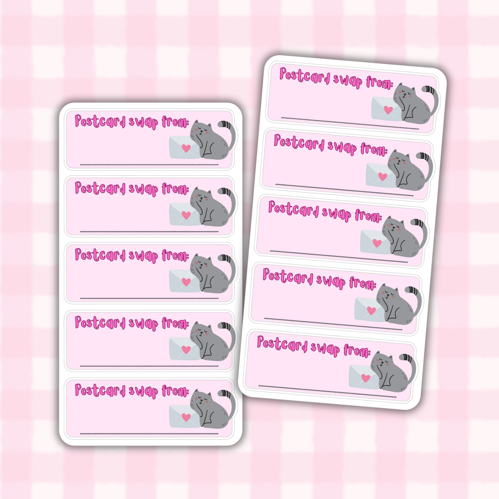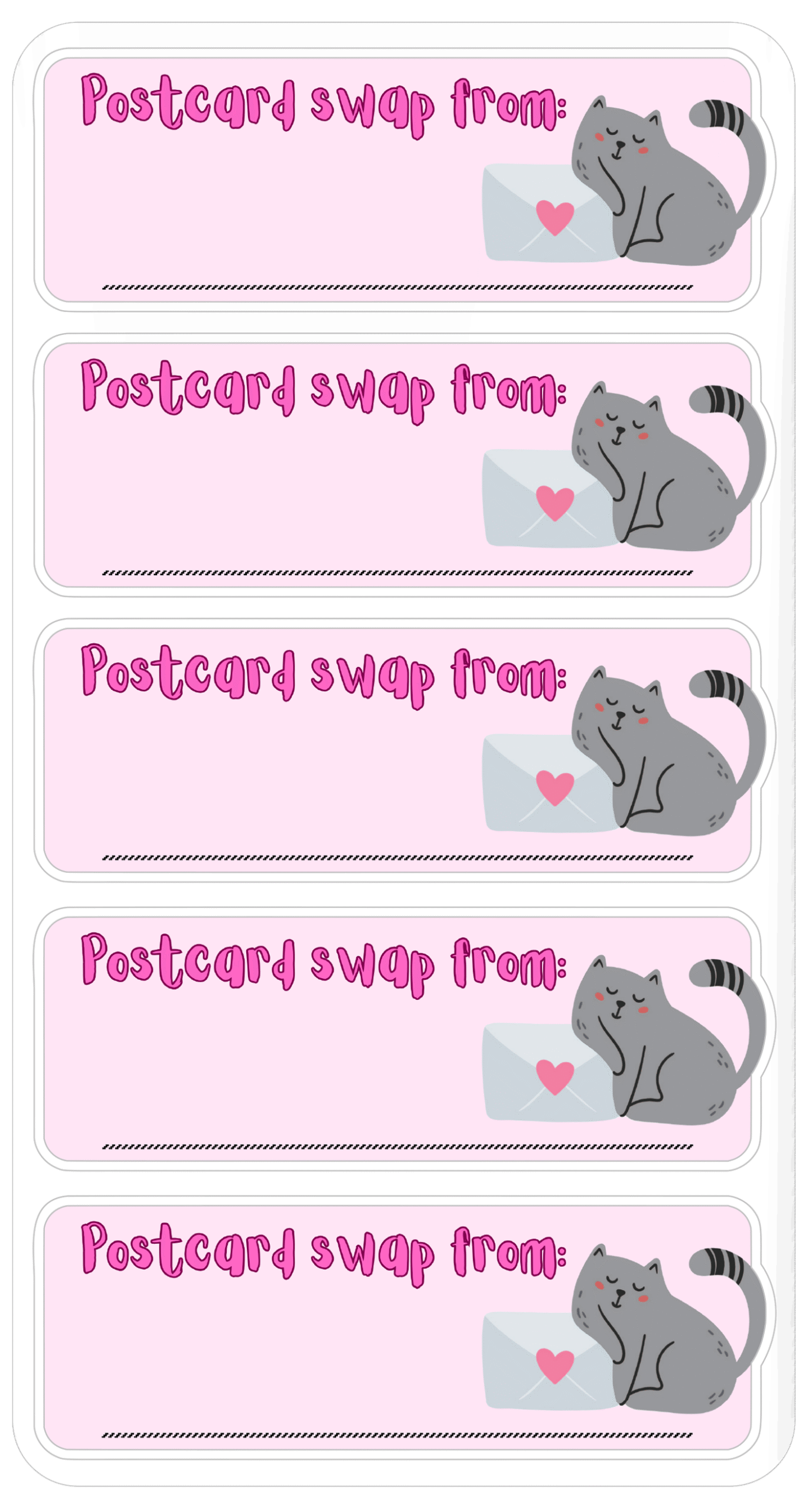 These pink swap stickers save me when I prepare postcards for exchanges. Each label has a cute grey cat holding an envelope and a space where I can write my name or a small note. It is a simple way to make every outgoing postcard feel more personal and friendly.
