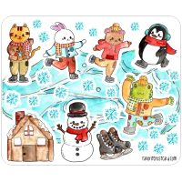 Bundle up – it’s time to hit the ice! This cheerful sticker sheet features adorable winter friends skating across a frozen pond: a penguin, bunny, bear, cat, frog, and even a snowman ready to join the fun.