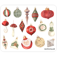 A nostalgic touch for your holiday season. These watercolor stickers capture the charm of old-fashioned glass ornaments: from delicate mushrooms and Santas to classic red and gold baubles.