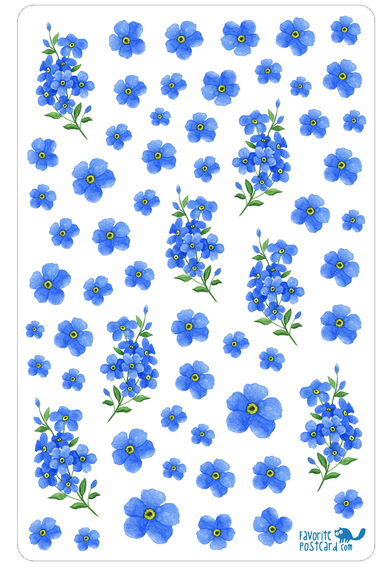 Soft blue forget-me-not watercolor stickers – delicate floral details for decorating postcards, letters and journals.