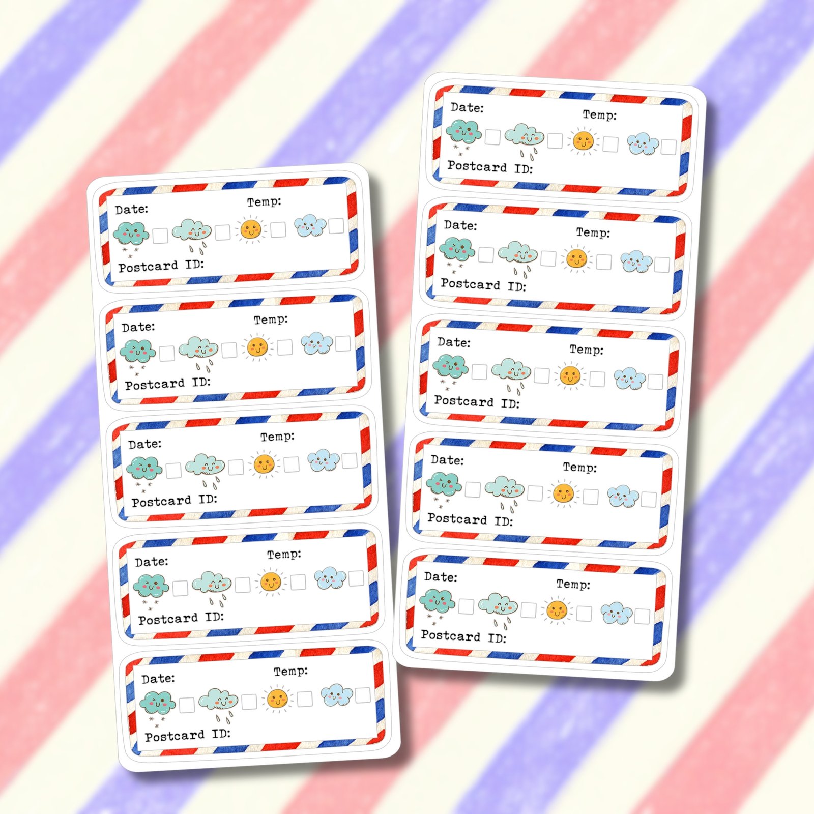The stickers are easy to peel and stick, and they have blank spaces where you can write the date, temperature, weather, and postcard ID.