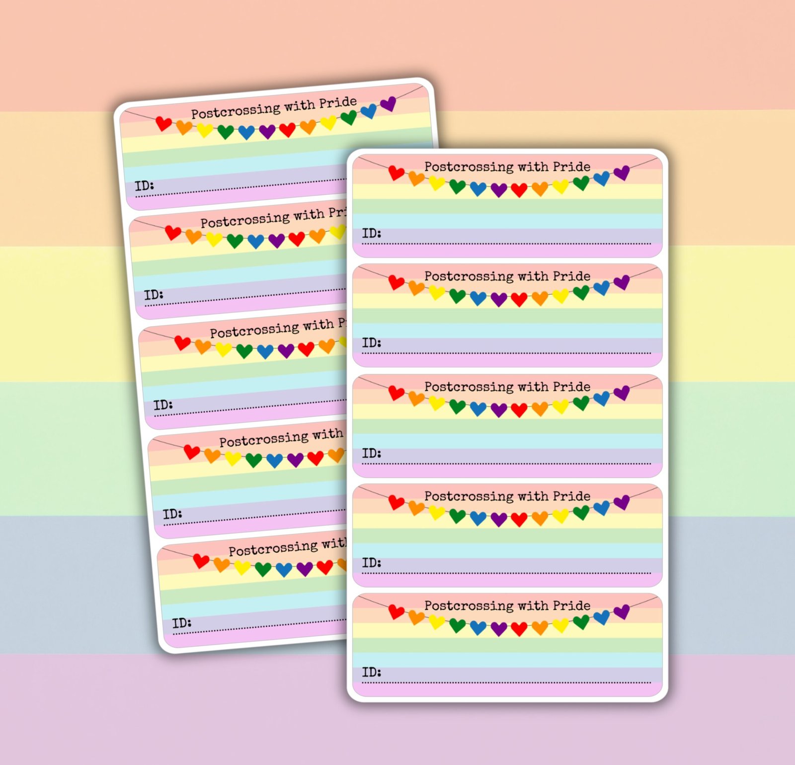 Each sticker includes space for your Postcrossing ID, making registration easier while also adding a clear visual message. The rainbow background and heart details keep the design expressive but still clean enough for everyday use.