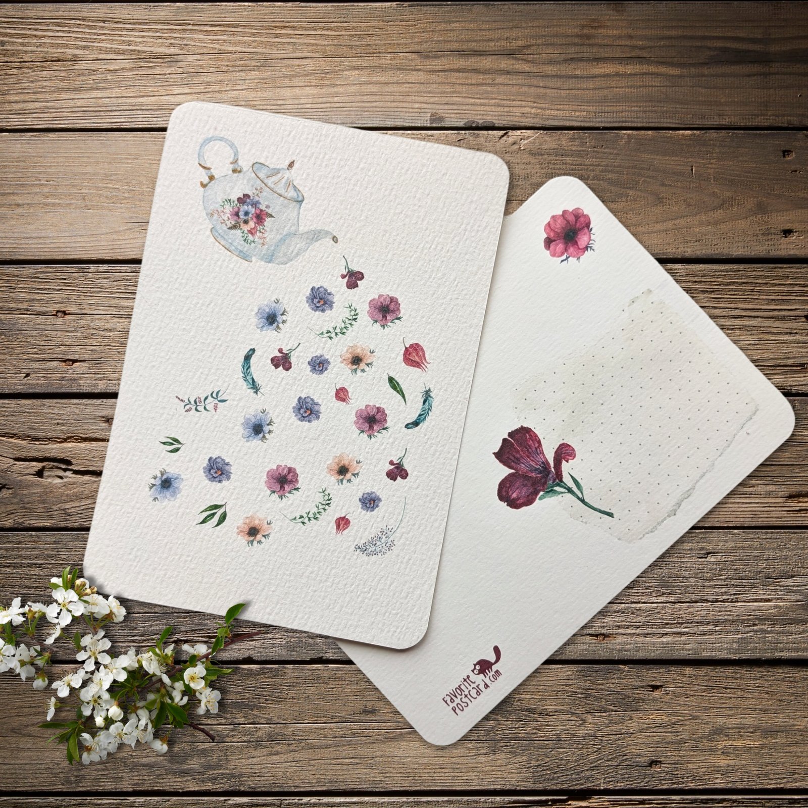A vintage-style teapot gently pours out scattered watercolor blossoms, as if the flowers were steam. The composition is airy and minimal, and the textured fine art paper enhances the softness of the illustration.