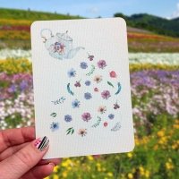 Postcard size: ~10.5 x 14.85 cm, textured watercolor paper. Colorful print in both sizes. Rounded corners.